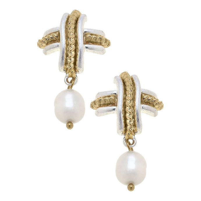 Serena Cross Pearl Drop Earrings: Two-Tone