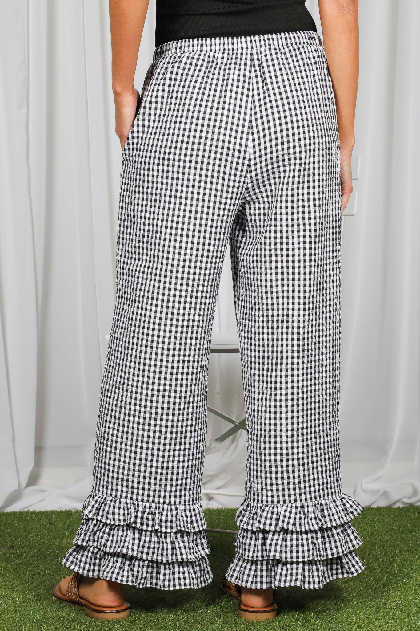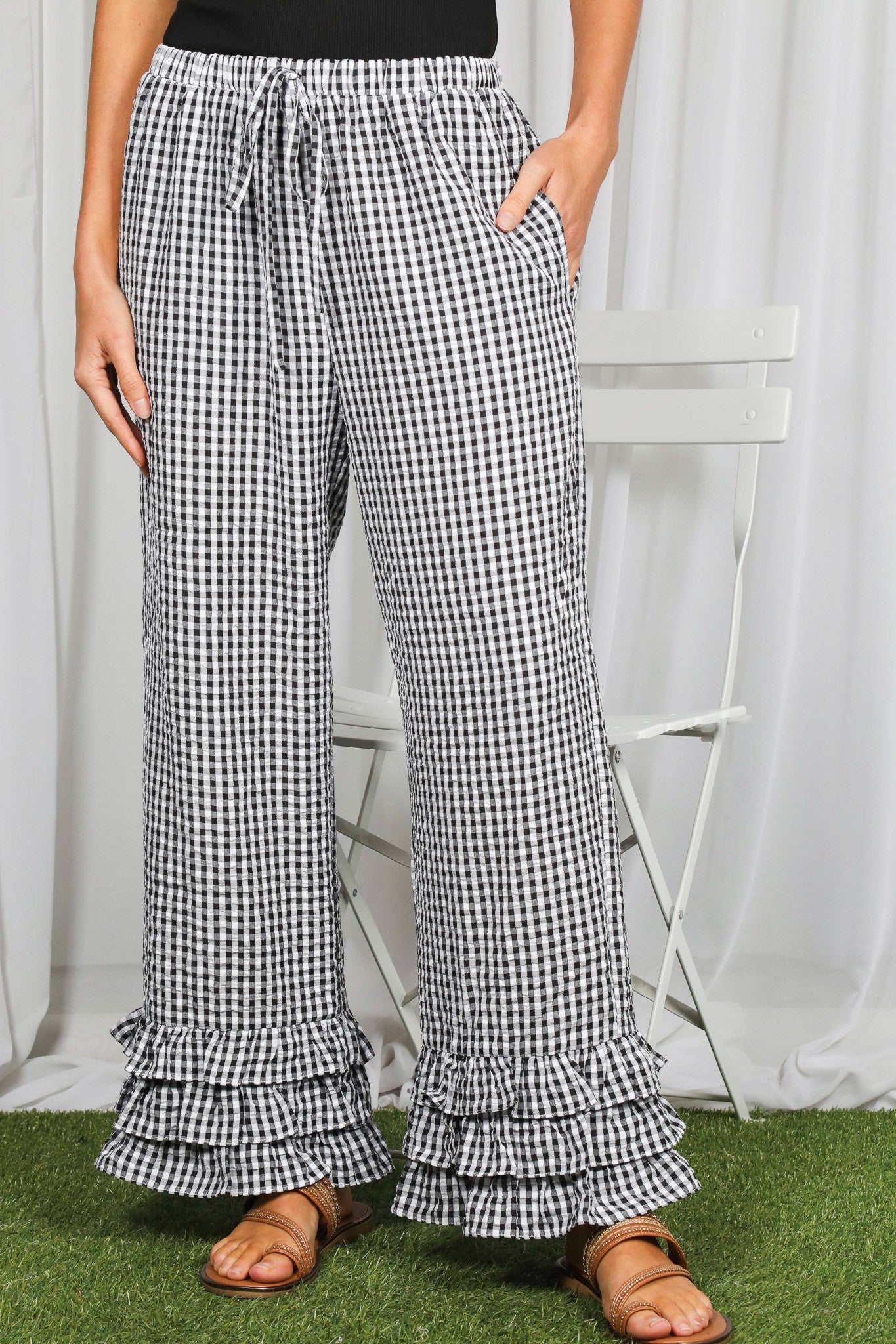 These gingham ruffle hem cropped pants are a must-have for lovers of feminine details, playful fashion, and effortless everyday charm.