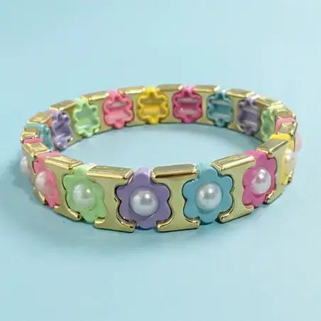 Meet Florence. Her crisp enamel finish serves as the perfect backdrop for bold colored flowers filled with personality. At the centers, pops of color, delicate iridescent beads or pearls shimmer and shine, adding a magical finishing touch.