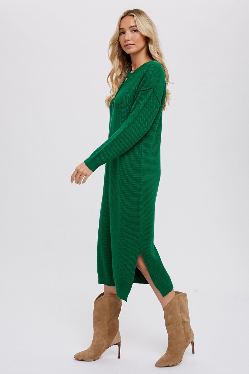 Effortlessly polished with a cozy twist, the Button Front Midi Sweater Dress blends fall-ready comfort with timeless style.