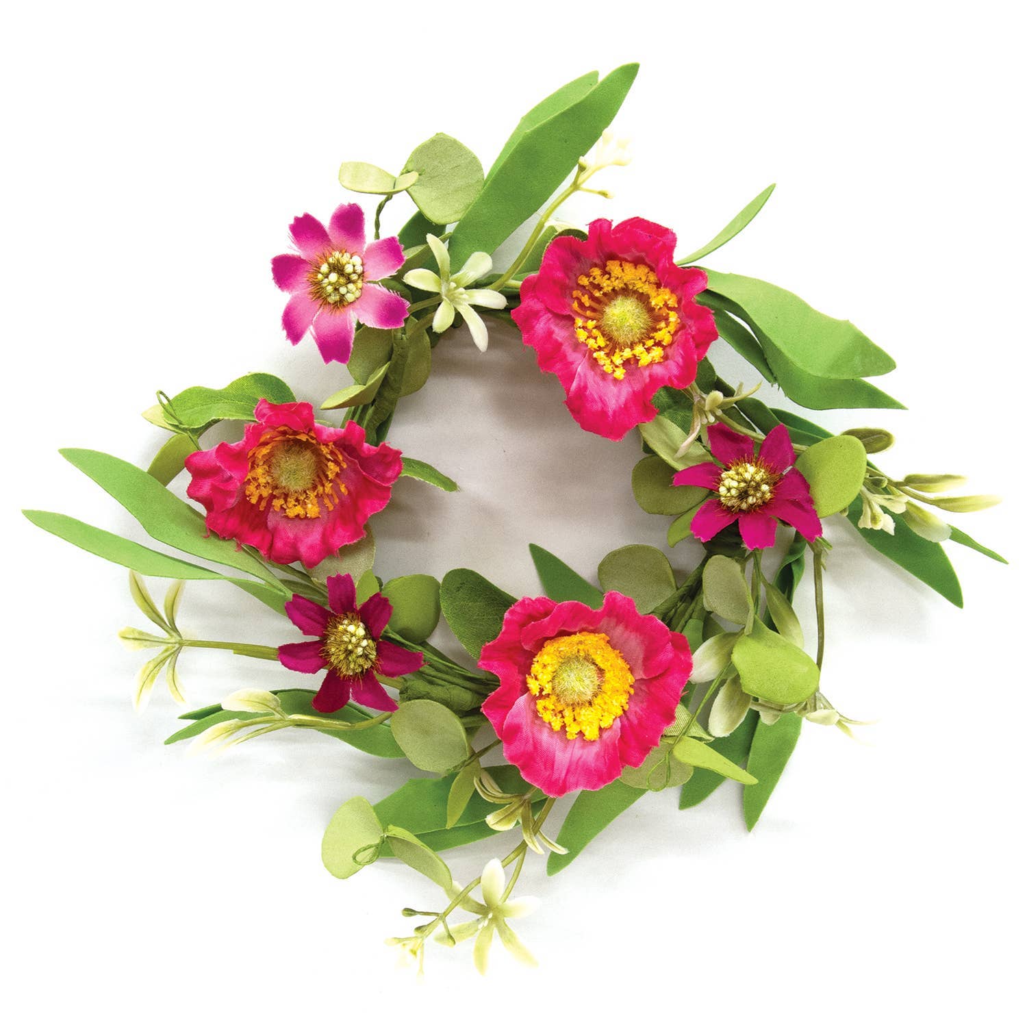 The Sunset Poppy & Wildflower Candle Ring features fresh, colorful design to complete indoor decor. The ring has a green-wrapped base and flexible branches adorned with leaves made from foam and fabric. Pink and red faux poppies and wildflowers blossom along the ring, accented by small green and white plastic flowers. The voluminous design features a variety of textures for a realistic look. Measures 3.5” in inner diameter and approximately 6-8" in outer diameter.