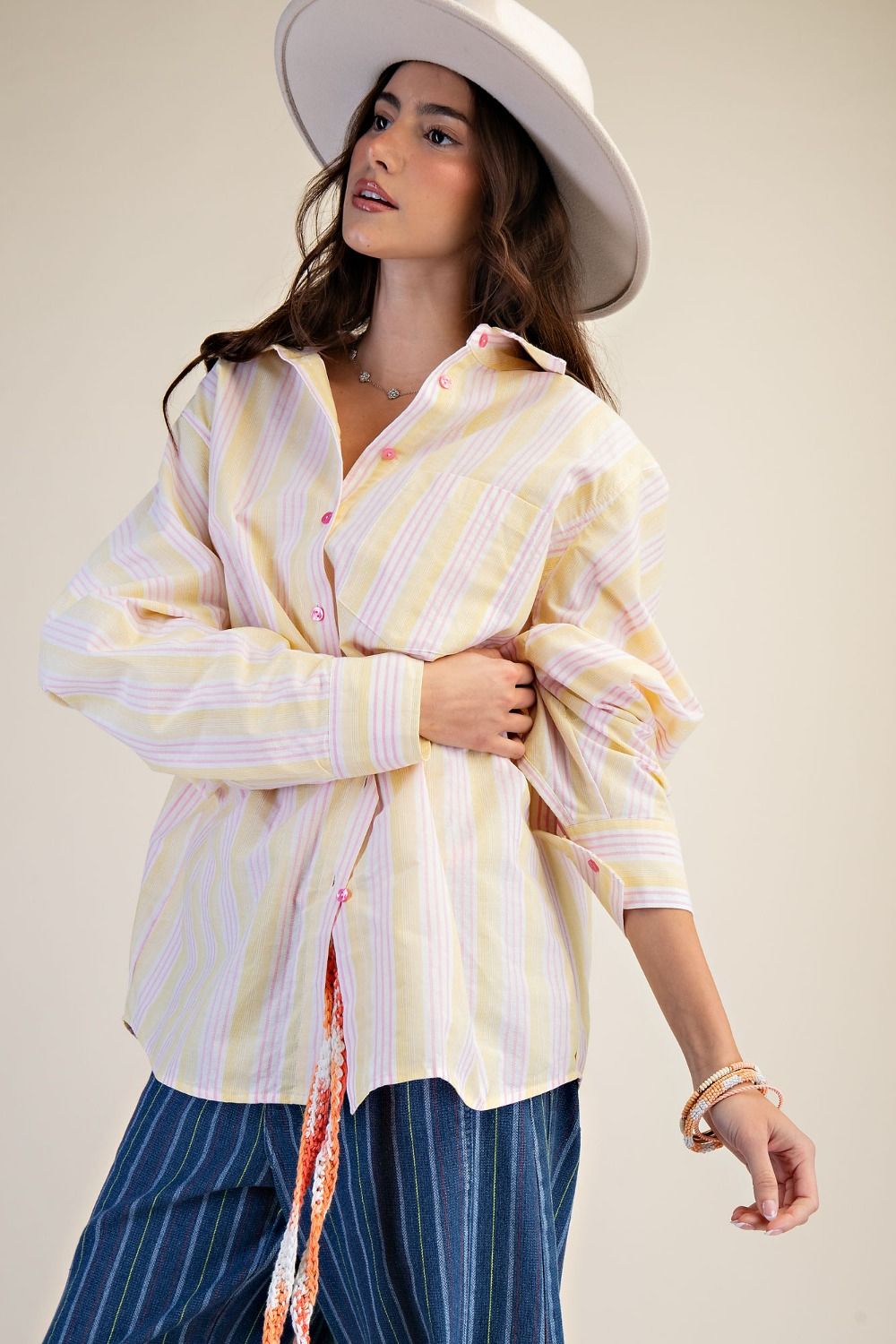 Timeless, polished, and effortlessly chic — the Pink & Yellow Stripe Button Down Shirt is a fresh wardrobe staple designed for everyday sophistication.