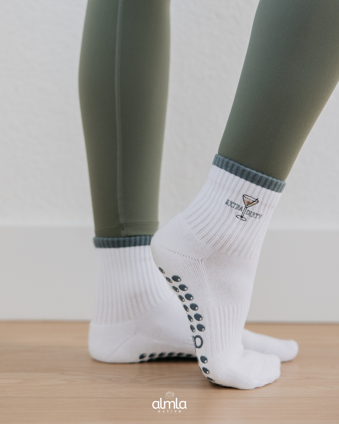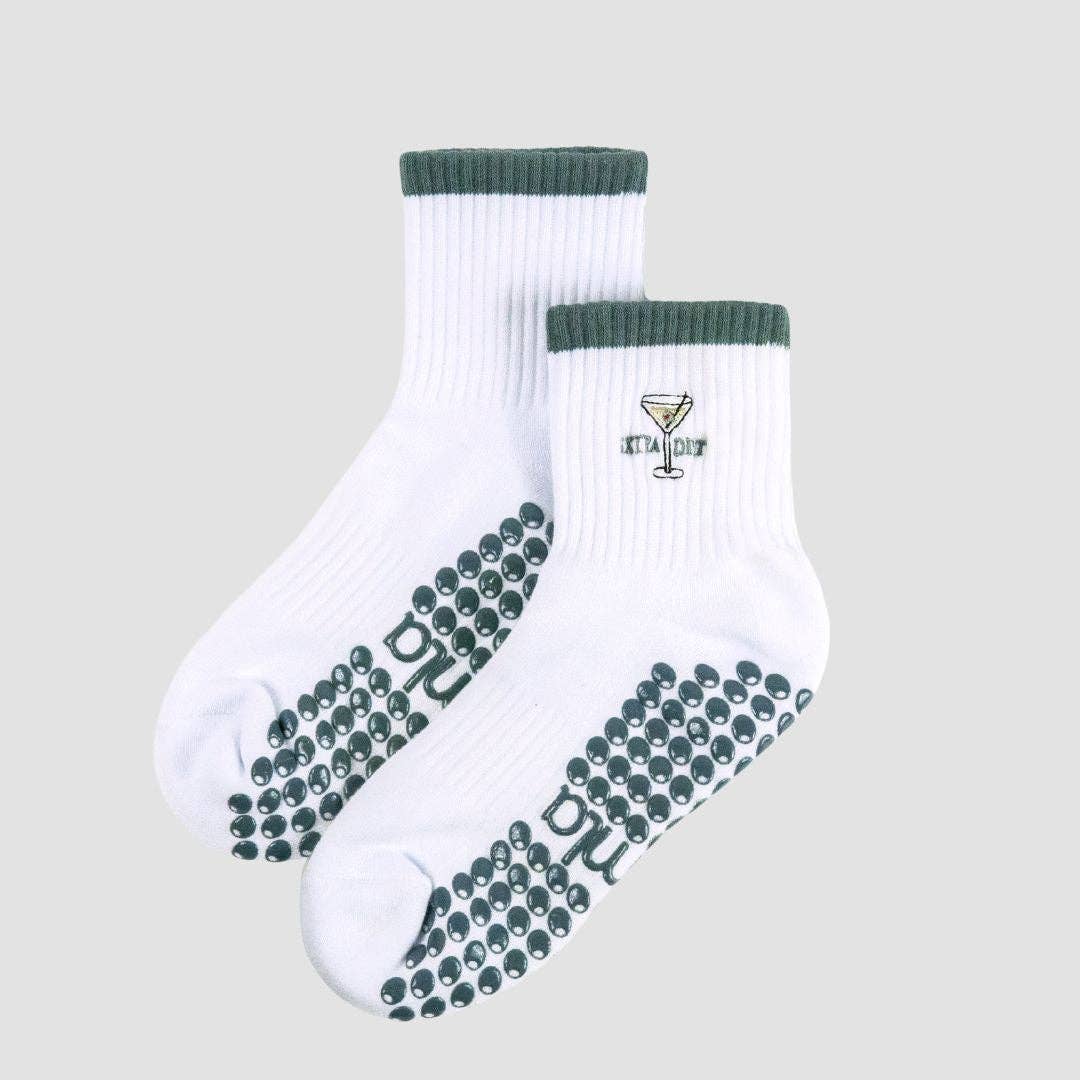 Introducing Extra Dirty Pilates Grip Socks Featuring embroidered dirty martini details on a white sock and premium olive-shaped non-slip grips for the perfect blend of style and stability in the studio or on the go. Pairs perfectly with black, gray, and green activewear, making it a versatile staple for every Pilates, barre, or yoga lover. Crafted for durability and comfort: 85% Cotton | 12% Nylon | 3% Spandex