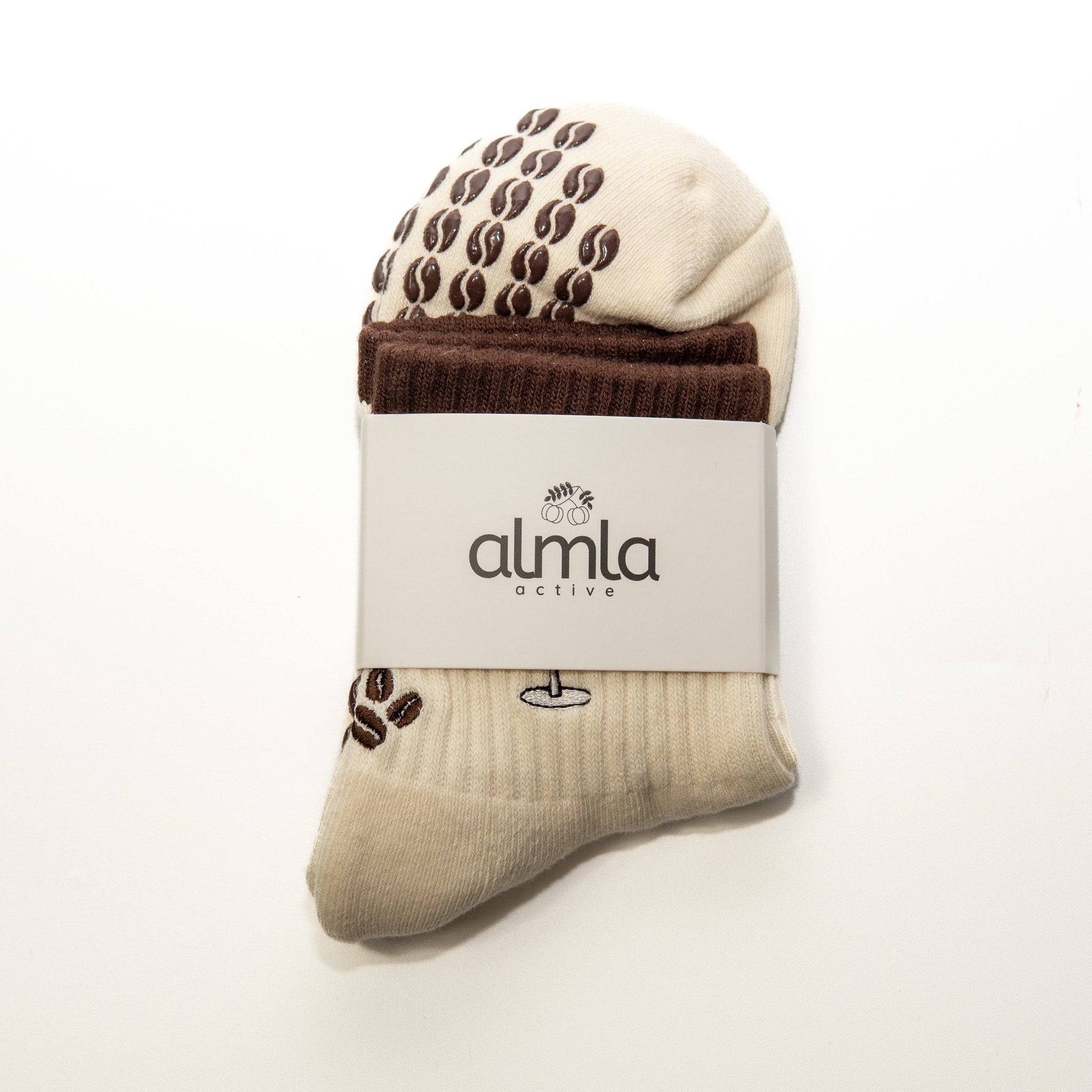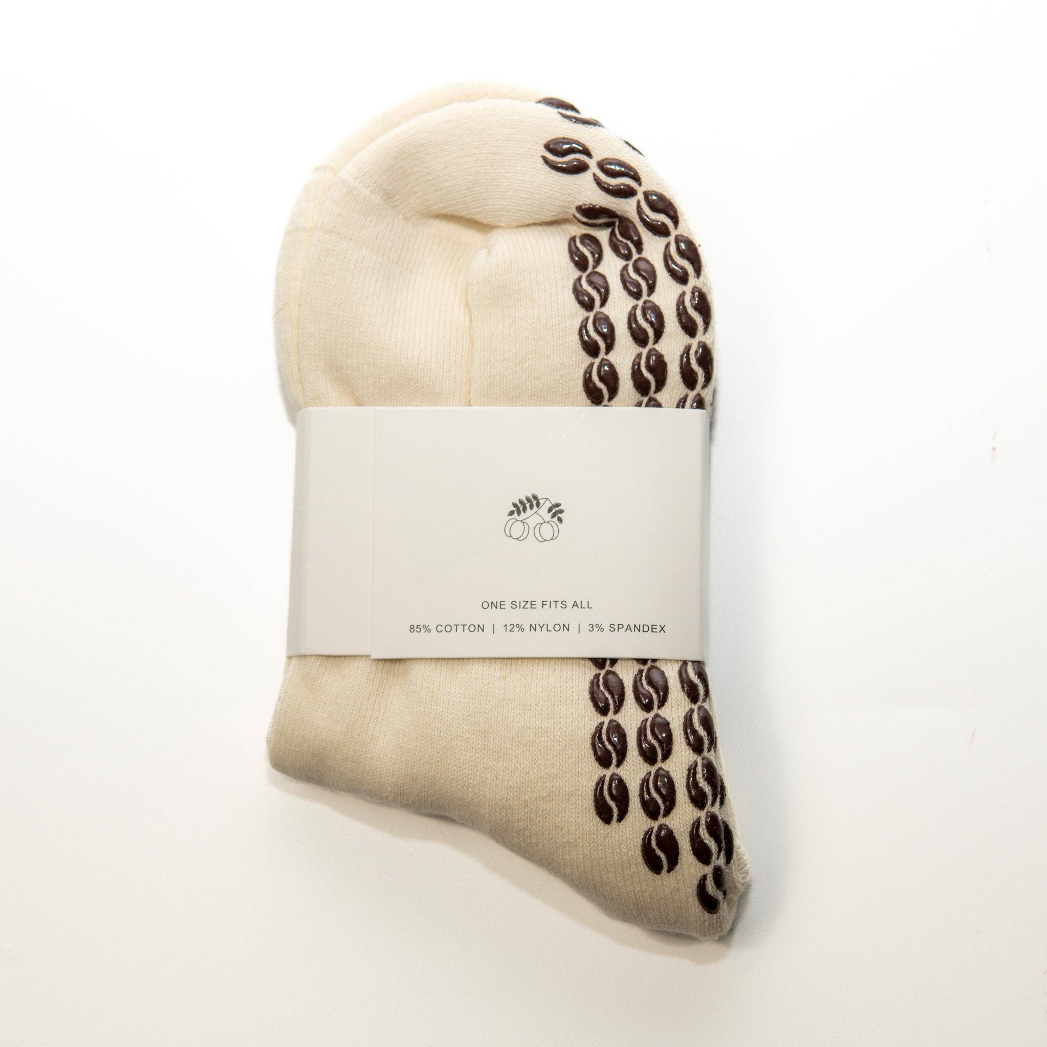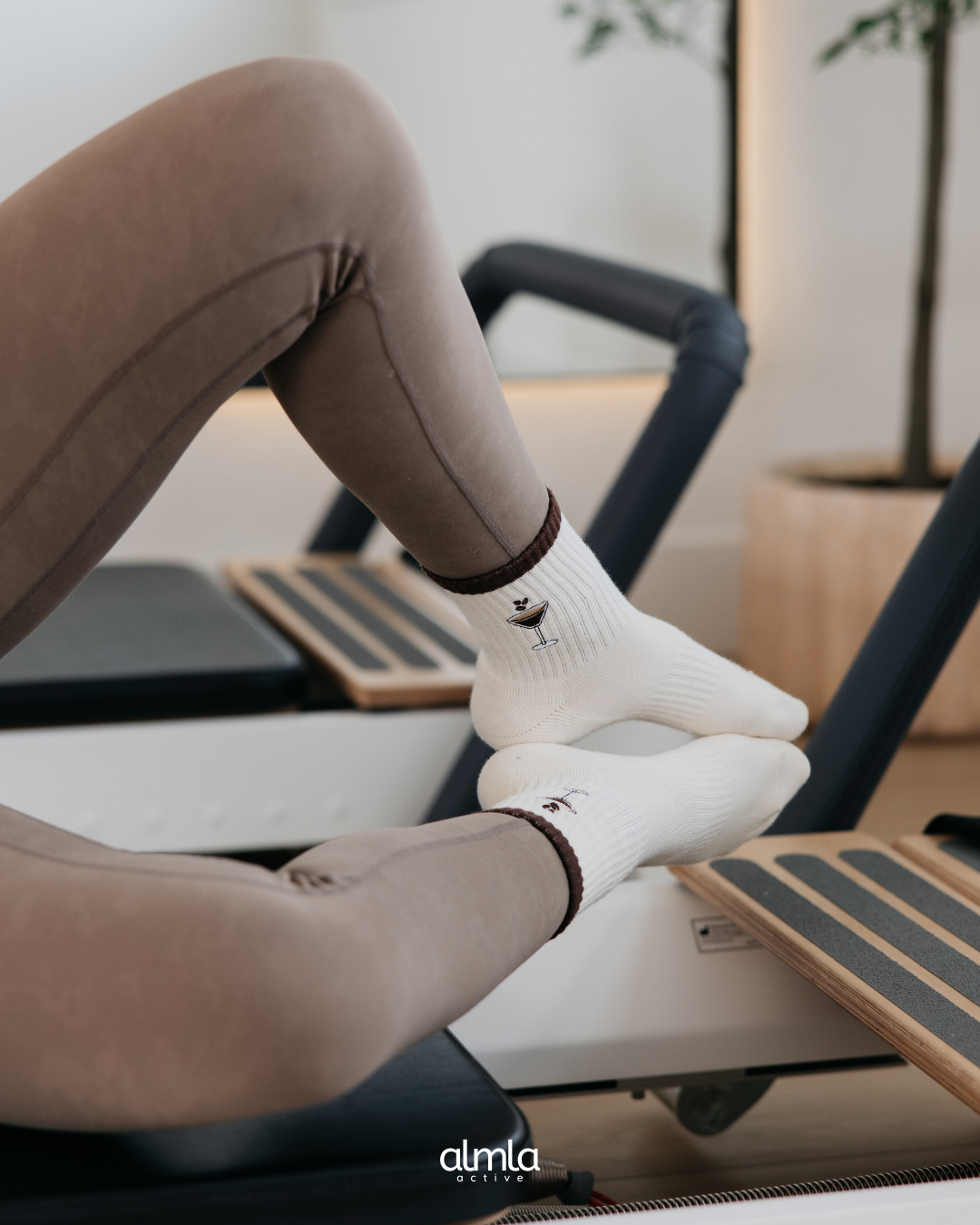 Introducing Espresso Martini Pilates Grip Socks Featuring embroidered espresso martini details on a cream sock, espresso bean detail on the back, and custom espresso-bean-shaped non-slip grips for the perfect blend of style and stability in the studio or on the go. Crafted from a premium cotton blend for comfort, durability, and breathability, these cream & brown Pilates grip socks pair effortlessly with your neutral and coffee-toned activewear or everyday loungewear.