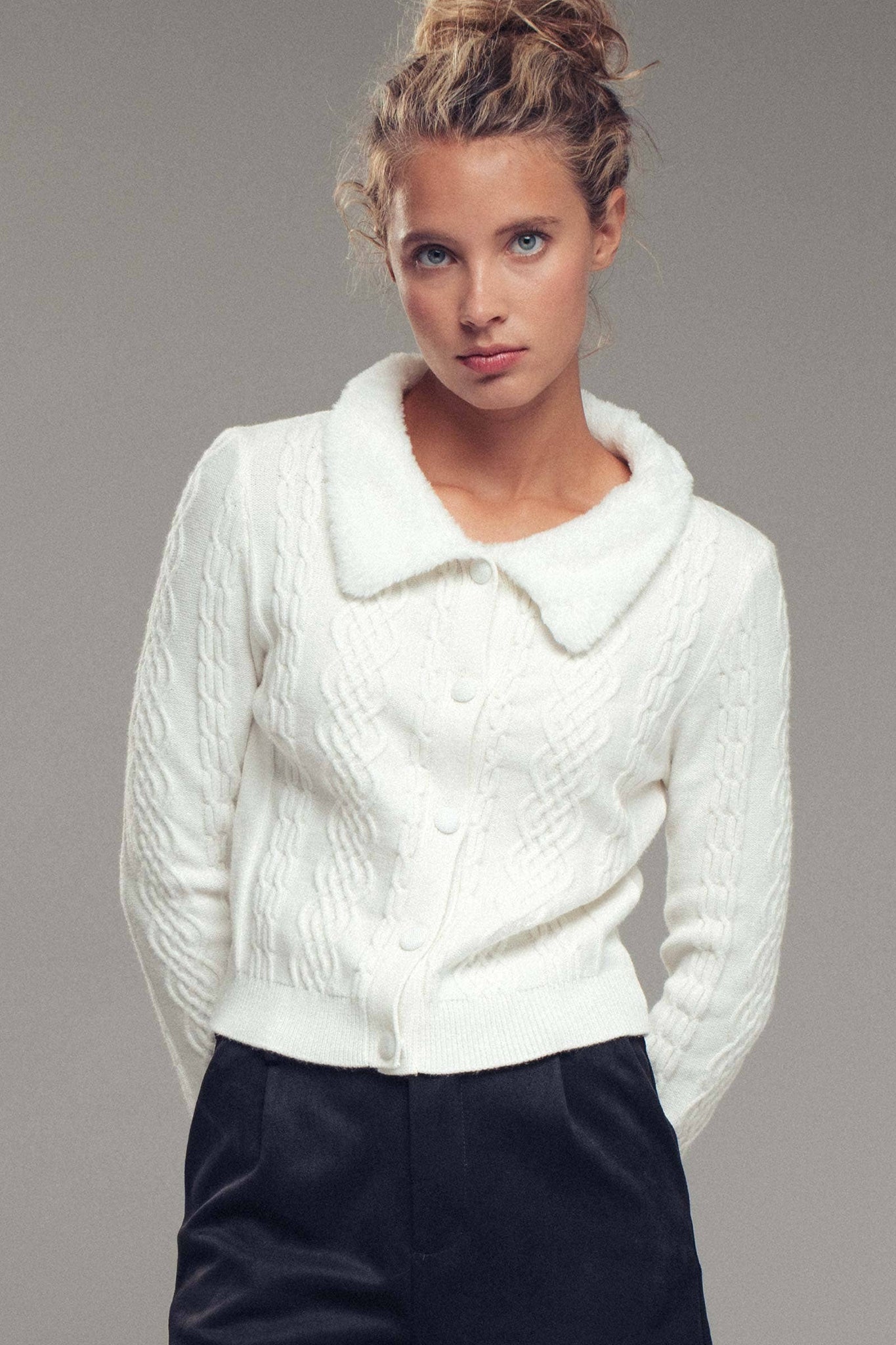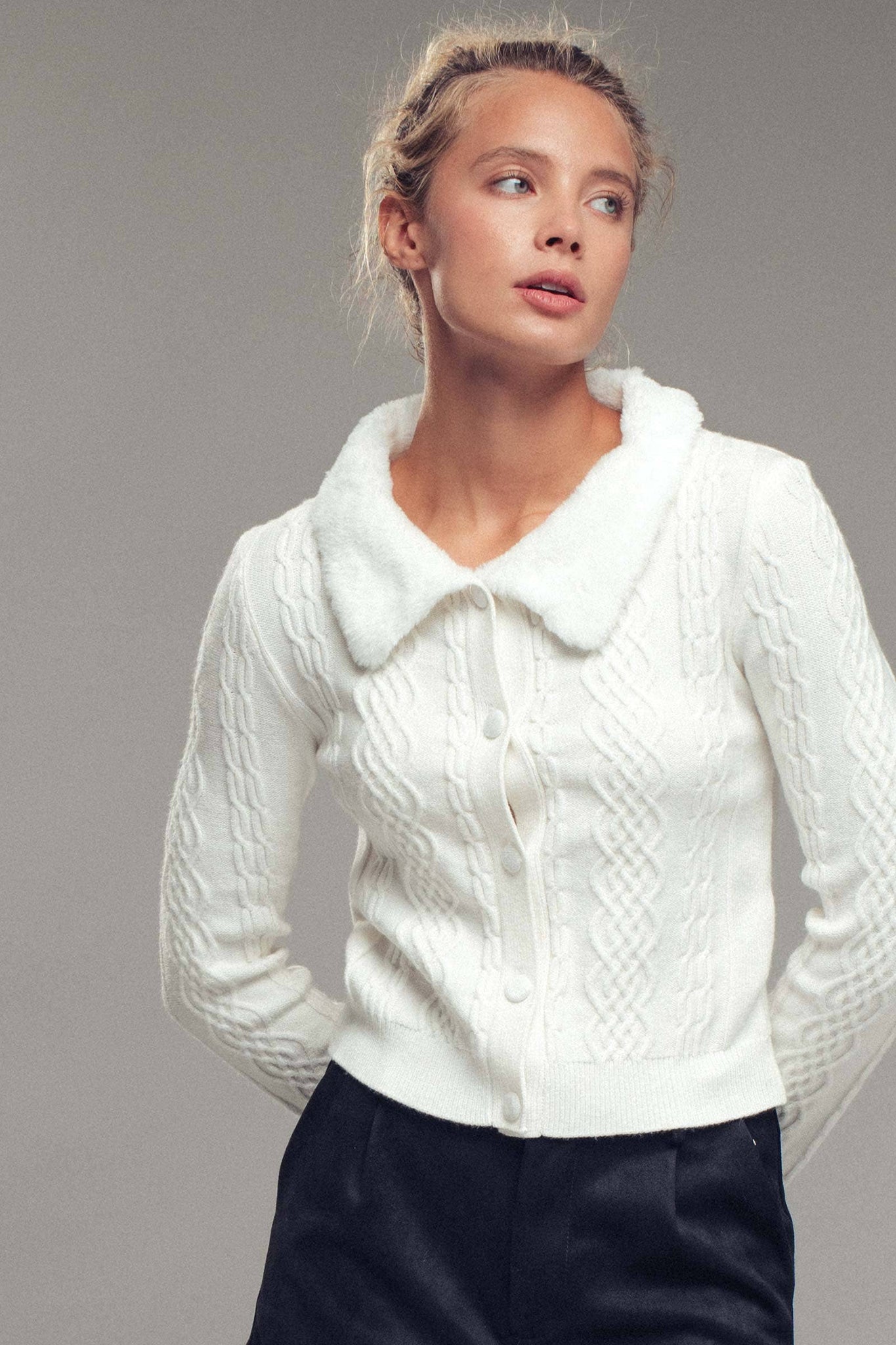 Elevate cozy style with this brown cable knit cardigan, featuring a plush faux fur collar for a luxe touch. Designed with a slim fit, tonal button-front closure, and ribbed trims, it’s perfect for pairing with skirts or trousers for chic cold-weather looks.