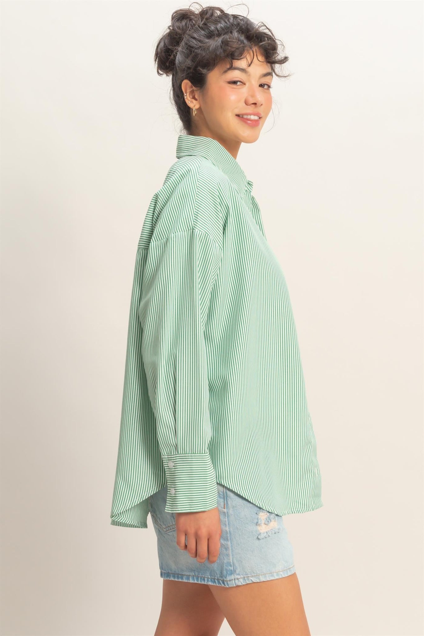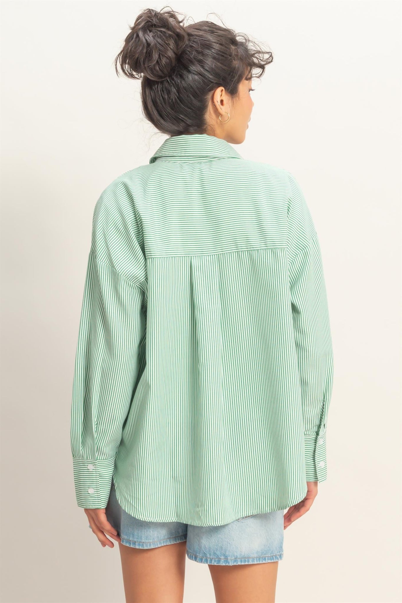 This green striped button-up shirt is a must-have for lovers of elevated basics, relaxed tailoring, and effortless everyday style.